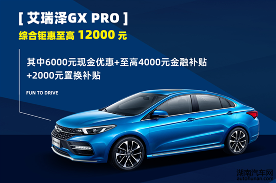 奇瑞替你全面减压,轻松迈出新步伐!五亿补贴来袭,助你0压力轻松开启新生活!奇瑞惠民购车季开启,凡选购艾瑞泽GX冠军版、艾瑞泽GX PRO、艾瑞泽5 PRO在内的奇瑞全系车型,可享受高额优惠。艾瑞泽GX PRO综合钜惠至高12000元,包括6000元现金优惠+至高4000元金融补贴+2000元置换补贴。