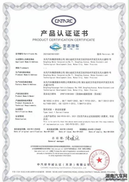 “中国生态汽车认证”是基于汽车的空气质量、车内噪声、有害物质、综合油耗、尾气排放、可再利用率、可回收利用率等指标进行评价的综合认证。其评测结果可以权威地反映一台车的综合环保水平,被认为是汽车行业最具权威性的“环保裁判”。