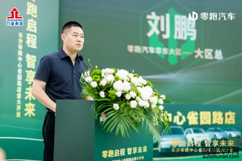 零跑汽车大区总刘鹏先生 首先登台,详细阐述了零跑汽车坚持核心技术全栈自研的战略优势,回顾了其在国内与国际市场取得的瞩目成就及重要合作。他表示:"长沙雀园路店是零跑在长沙市场的关键落子,我们将以用户需求为核心,通过产品迭代与服务升级,助力长沙构建绿色智慧出行生态。"