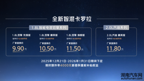 12月21日,“全球好品质 中国新家轿”全新智混卡罗拉焕新上市,共推出4个版本,厂商直销价为:9.9万元-11.8万元。即日起至1月31日期间下定,限时额外享受4000元新春购置税补贴权益。