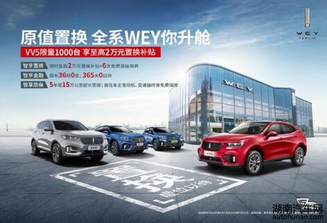 一场专为新生代年轻人准备的“原值置换 全系WEY你升舱”的暖心举措已经开启,对于即将加入VV5大家庭的年轻车主,WEY凭借“以用户为中心”的理念,“让豪华触手可及”的使命,通过超越期待的实在利益,带来关怀与温度。WEY VV5始终与年轻人站在一起,保持经济自由,保持生活自由,原值置换,即刻行动。
