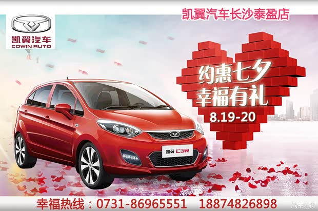 那些都不是事儿!只要您8月19-20日,到凯翼长沙泰盈4S店赏车购车,金装凯翼C3R最大优惠达7002元(仅限一台)!就有机会获得我们为您准备的七夕幸福七重大礼,幸福的七夕从您来长沙泰盈店开始,幸福热线:0731-86965551 18874826898!